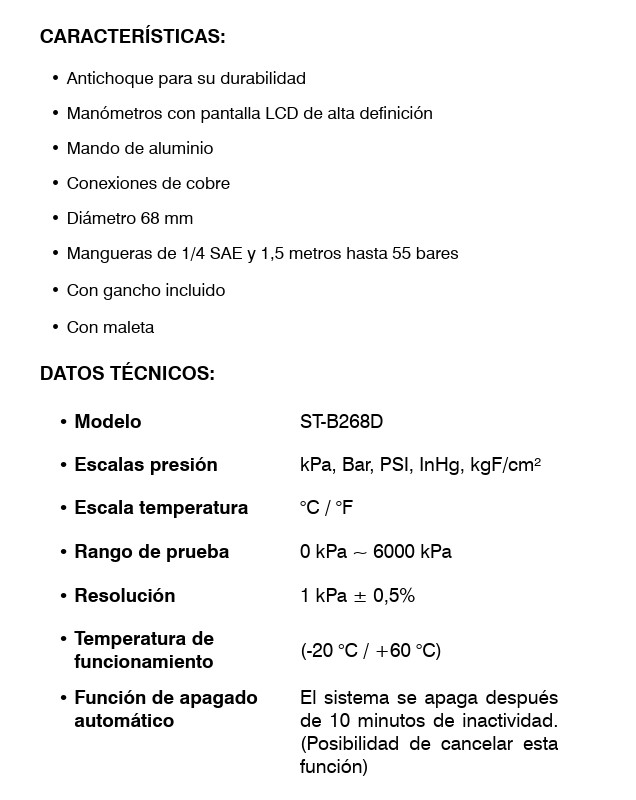 DESCRIPCIÓN: El analizador digital Super Stars ST-B268D es un analizador de alto rendimiento, en el que los manómetros de alta y baja presión están montados en una caja protectora fabricada en material plástico resistente a golpes y laterales engomados, asegurando el agarre y preservando la calibración del equipo.
