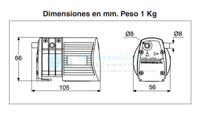 La bomba se suministra con una toma de 8 mm de diámetro externo para conectarla directamente al tubo de desagüe y a la salida integral del tubo, un kit de montaje antivibración y 4 cables de suministro electrico.